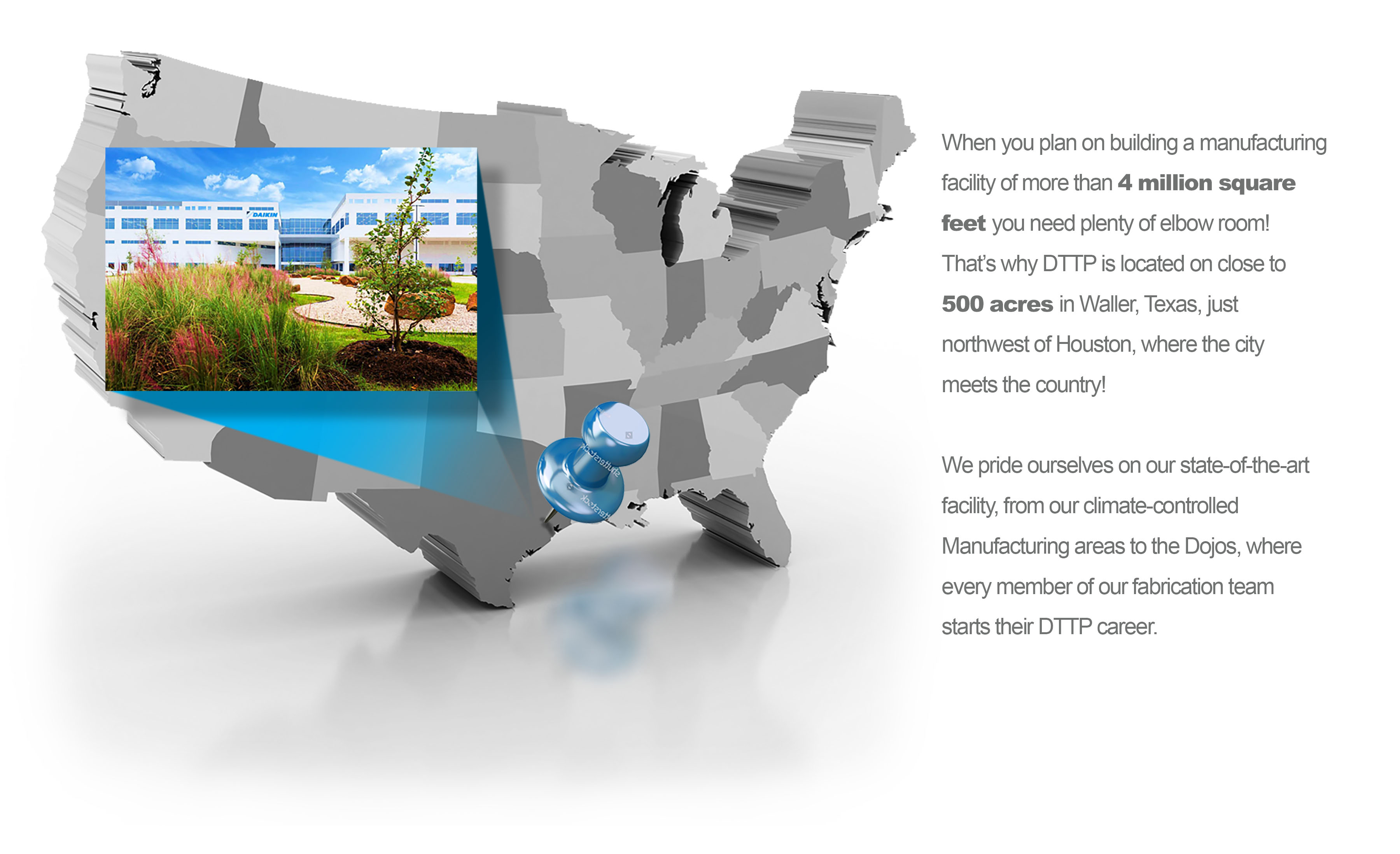 The U.S. Green Building Council certified DTTP as a LEED Gold facility in March of 2017. Buildings which are LEED Certified have a positive impact on occupants, while promoting renewable, clean energy and improved efficiency. From our industrial wastewater recycling system to the automatic water faucets in the restrooms, everything we do is planned with sustainability and the environment in mind. Our own VRV systems provide thermal comfort and are 36% more efficient than the standard. We have invested significant resources to ensure our building is compliant with the high standards of the USGBC and to provide our employees and visitors with a comfortable environment.